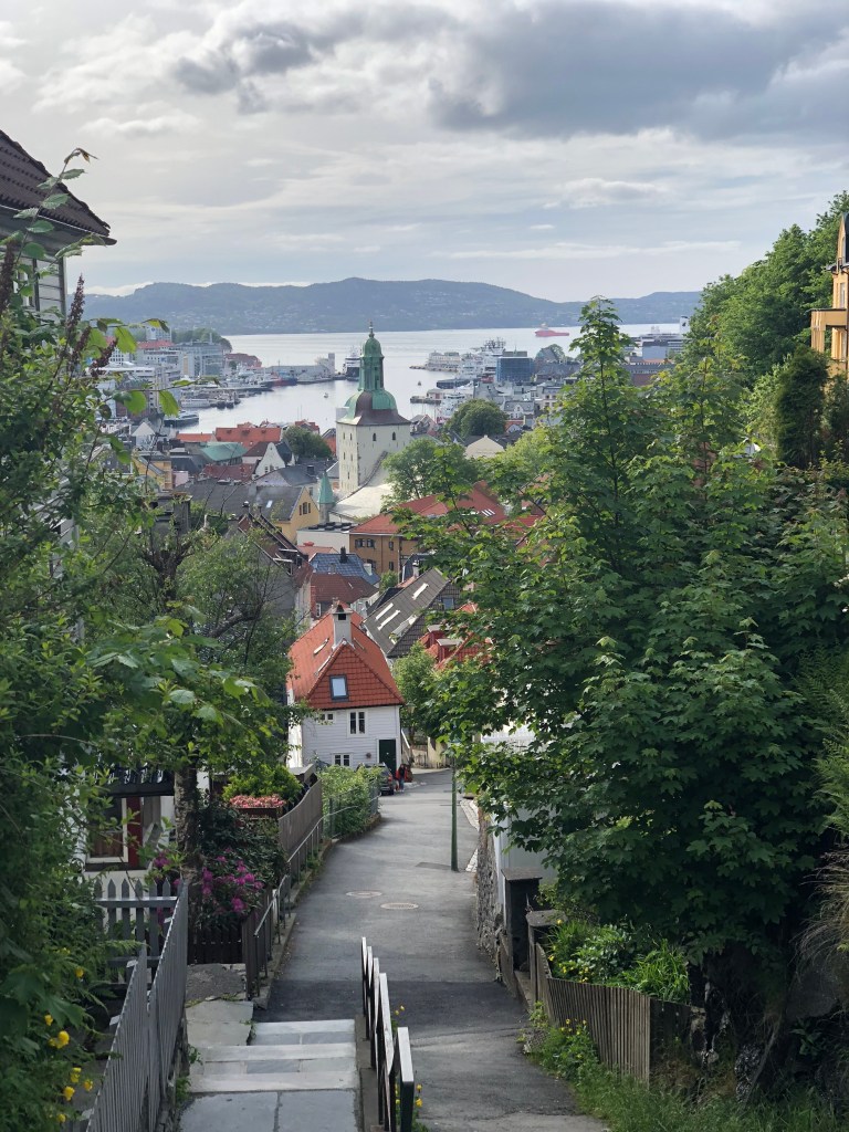 The light sprinkles of the morning gave way to sunshine in the afternoon, so we headed up the Floibanen Funicular. From there, we were rewarded with beautiful views of Bergen looking out from Mount Floyen.