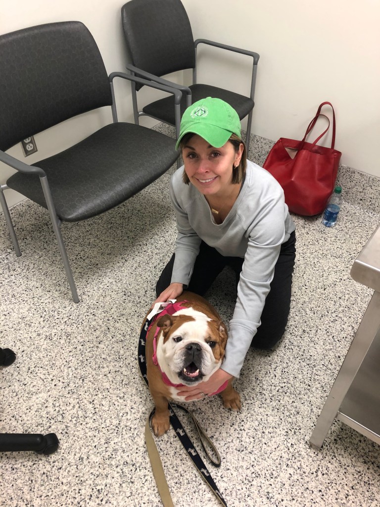 We did receive the best news we could hope for when the x-ray came back negative for other tumors. So, from there, we moved to the CT scan. Mabel would need to go under anesthesia for this scan and with Brachycephalic dogs (think smooshed faces), this is also a risk. I asked to see her before they took her back. She came into the room in pretty good spirits, happy to see us and I imagine running on a bit of adrenaline from all the change. I sat on the floor with her and sobbed. I told her she would be okay but also thanked her for the being my best friend. Adam and I took pictures with her; I tried to smile but I think my face still shows how utterly broken and scared I am in that moment. The OSU staff was so wonderful and just let us have our time to attempt to process all the new information.