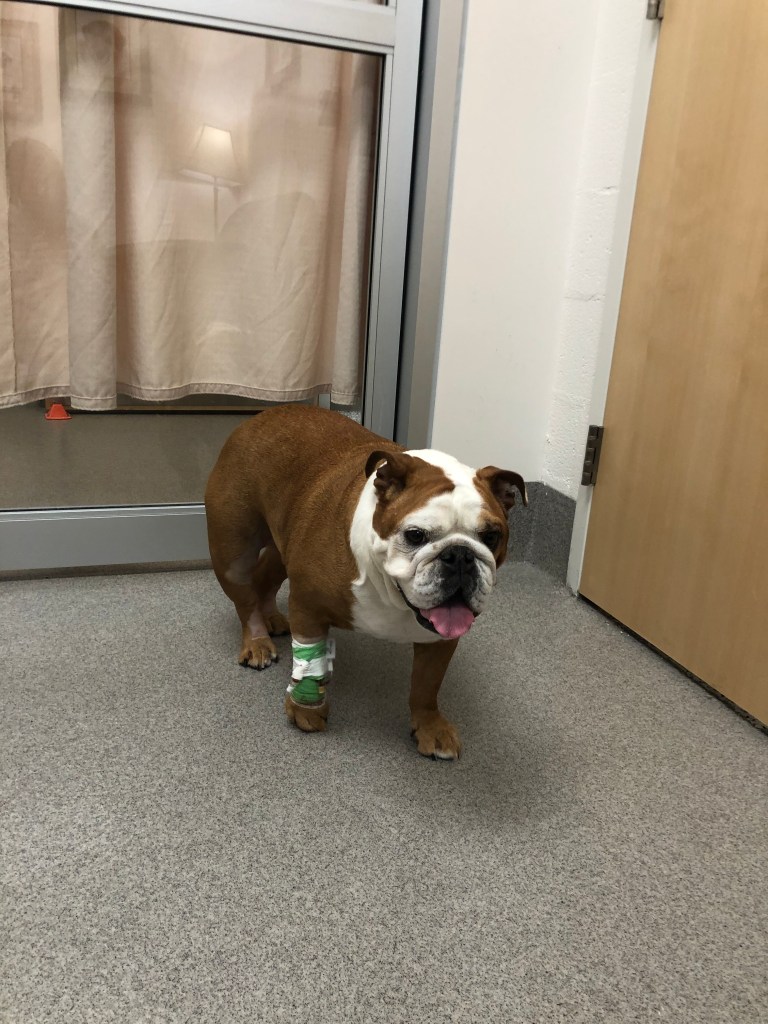 I could not wait to see my girl. And when she came in the room to see me, with her little wrapped paw, I was struck by how much she reminded me of herself as a puppy. For as nervous as I had been, I made myself channel that away so I could be as calm as possible for Mabel which I will admit is not always my strong suit. I got her to eat a tiny bit of food which was a victory as it is impossible to get Mabel to take so much as a treat when at the vet. And with my promising that I could get her to eat once we left, her surgeon told me I could take her home.